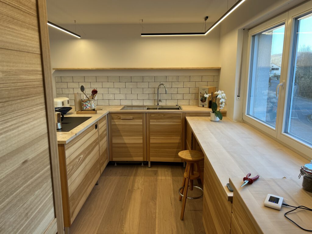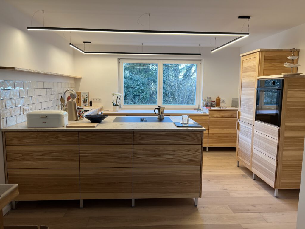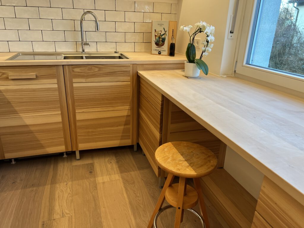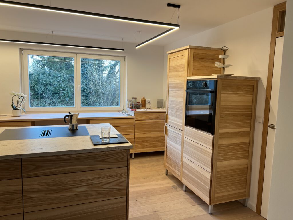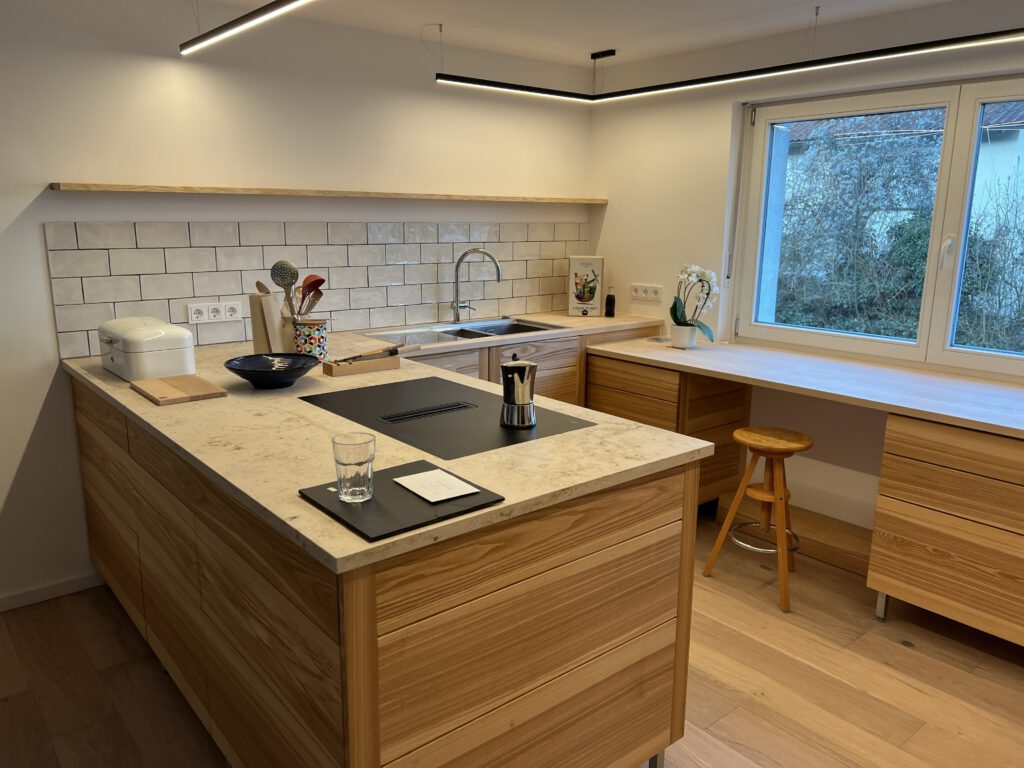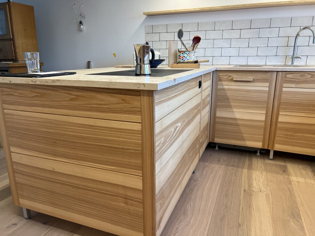Küche mit Kochinsel aus Esche und Feldahorn,Kochinsel mit Jurakalk Arbeitsplatte